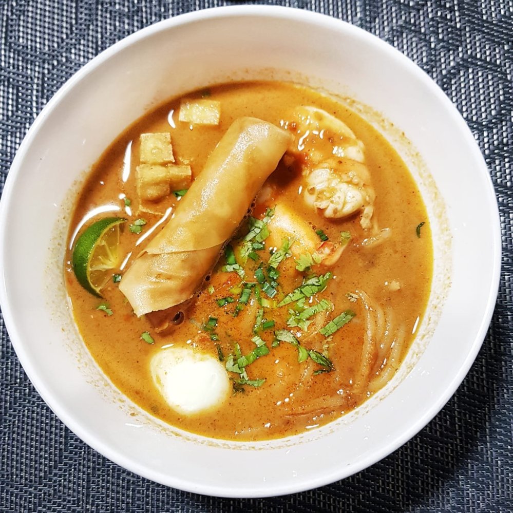 Prawn and crab infused mee siam with quail eggs, chives, tau pok, prawns, deep fried crab spring roll