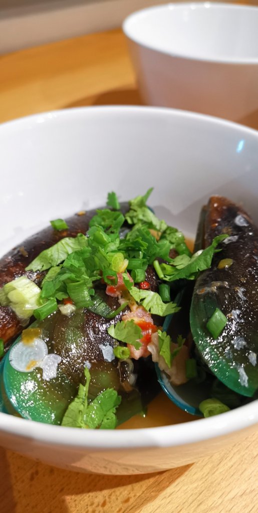 Mussels with Off Day Haze BeerAh Hua kelong mussels cooked in citrusy Haze Beer from Off Day Brewing Company, locally made lup cheong, yun cheong