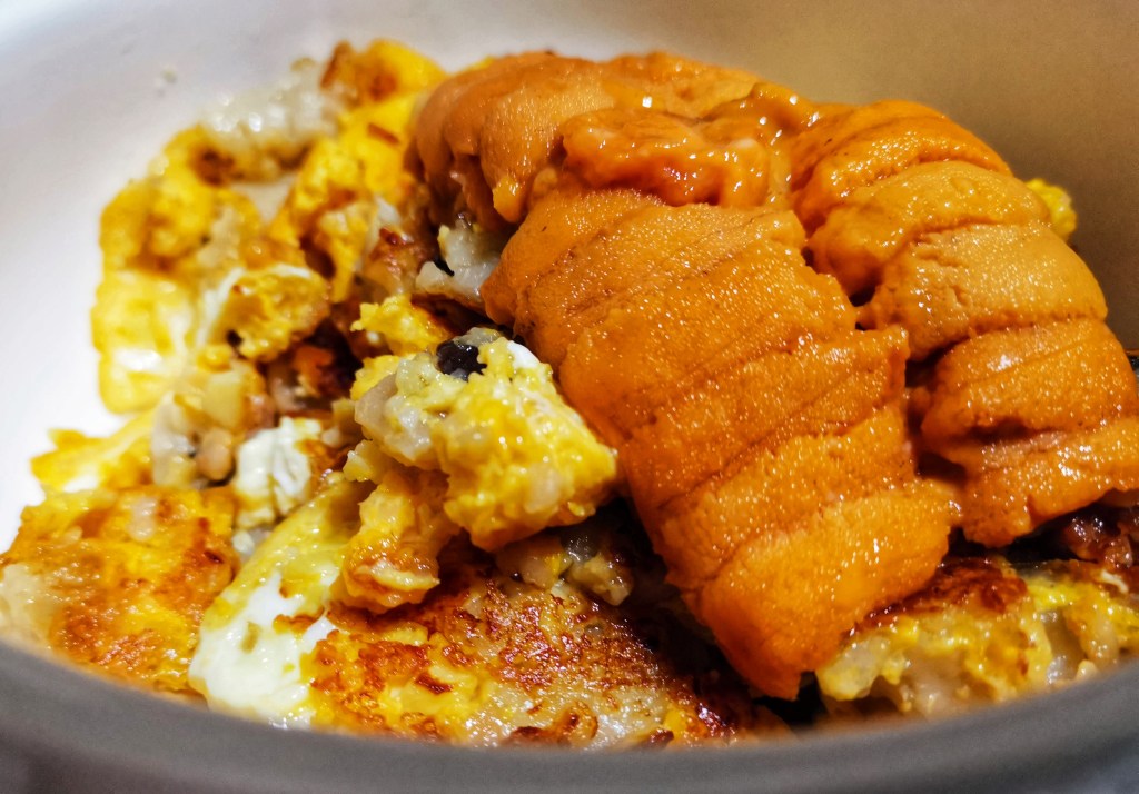 Ownself make carrot cake with scallops (instead of prawns), ownself make lup cheong and yun cheong. Fried with eggs and chye poh, topped with Uni.