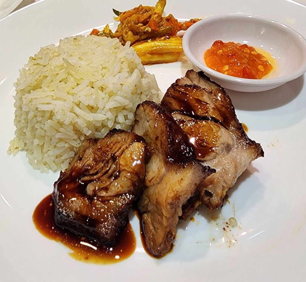 Kurobuta char siew fired at high heat in our pizza oven with nasi lemak, and lard sambal