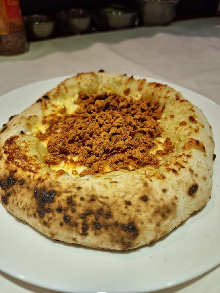 Slow-fermented pizza with white cheese sauce, and chicken floss