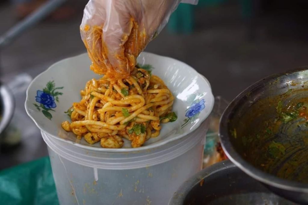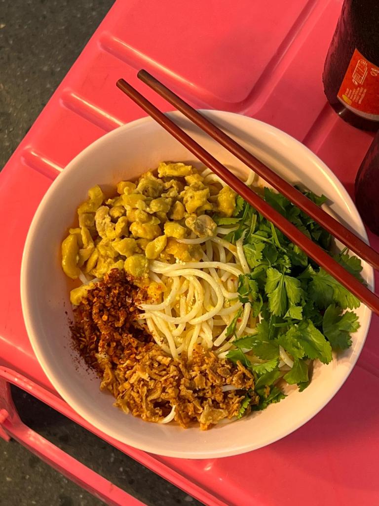 Often called Burmese carbonara, this is my fave noodle dish from Myanmar. Called Nan Gyi (thick rice noodles) Thoke (salad), it is tossed in a flavoured chilli oil, and thickened with chickpea flour. It is also served with a side of chicken curry, hard-boiled eggs, lime wedge, chilli powder, and coriander.
